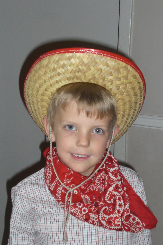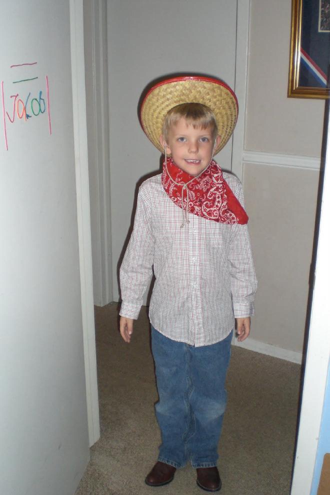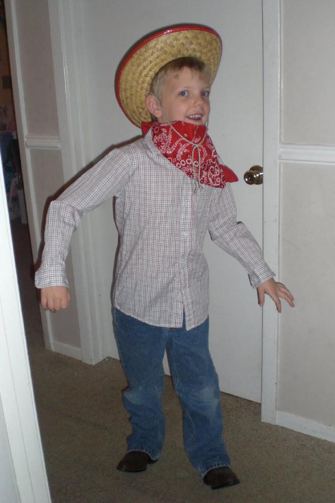So tonight we rustled up some Western duds for the kids to wear. Jacob does not wear blue jeans … ever. He announced however that he needed jeans and boots for this occasion. Luckily I had a pair of jeans in a hand me down bag from a friend and a pair of boots in another bag from a friend. I think his outfit turned out pretty cute.