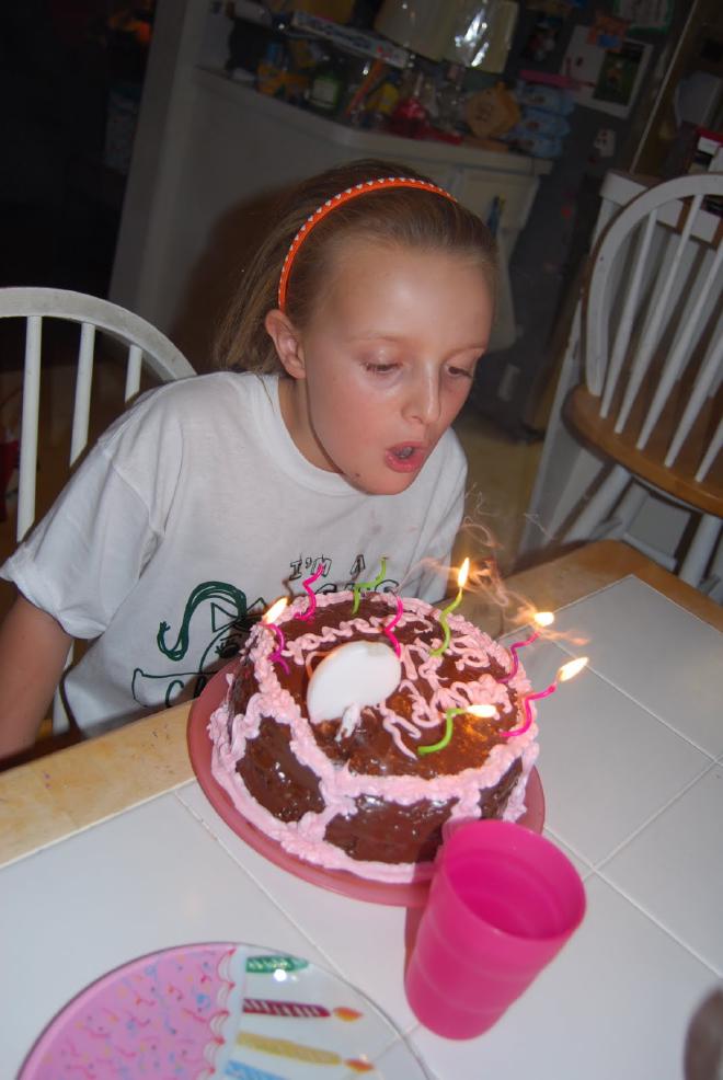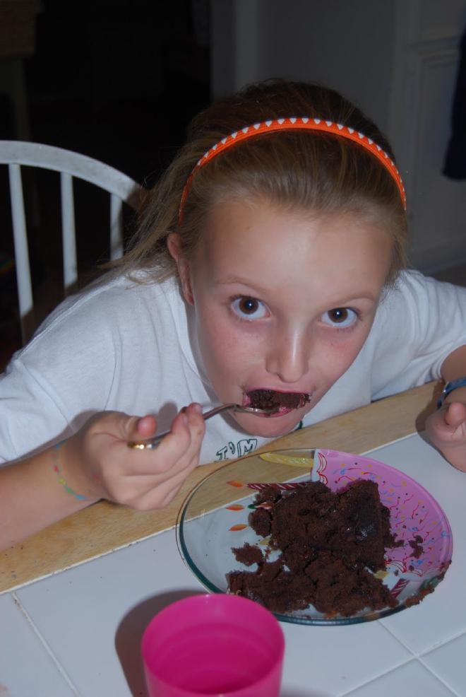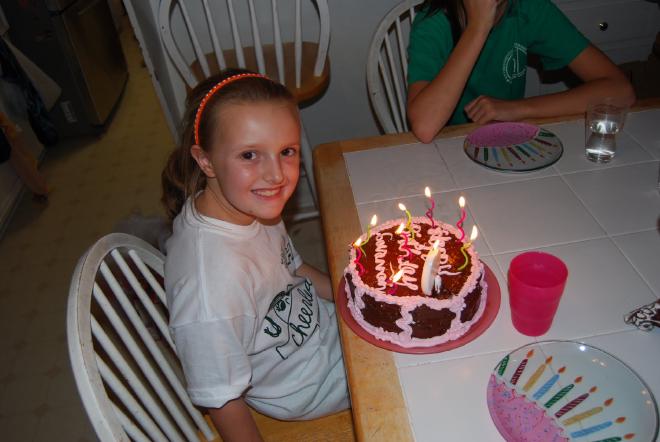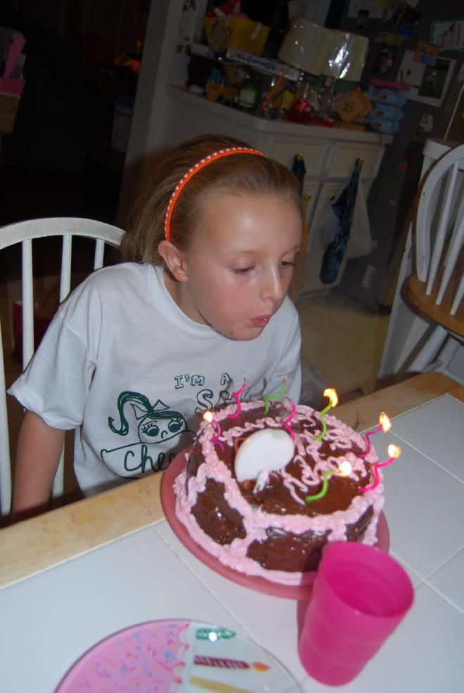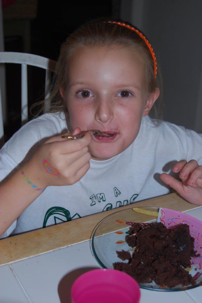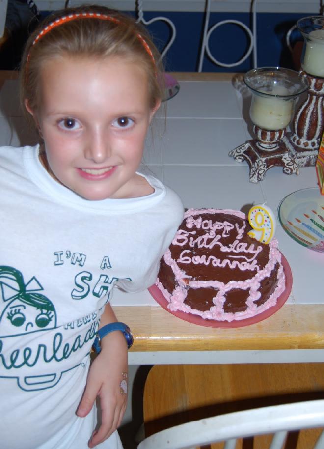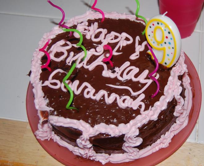 When she got home I had a cake for her. She requested chocolate cake with chocolate icing. And so Betty Crocker and I made her just that. I even bought a can of decorator icing (pink). When she saw the cake (and without knowing I had the pink icing) she asked … “Mommy, can you write Happy Birthday Savannah on it in pink icing?” Do I know my girl or what?!