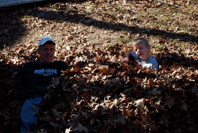 Blow and rake the leaves into a big pile, grab Daddy … and Jacob has PILES of fun!