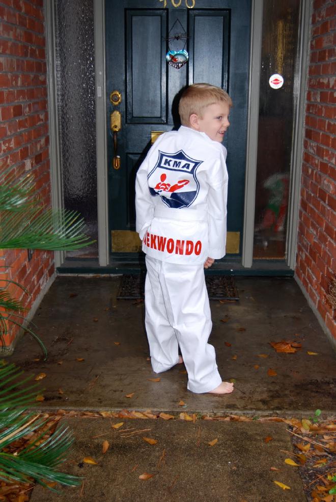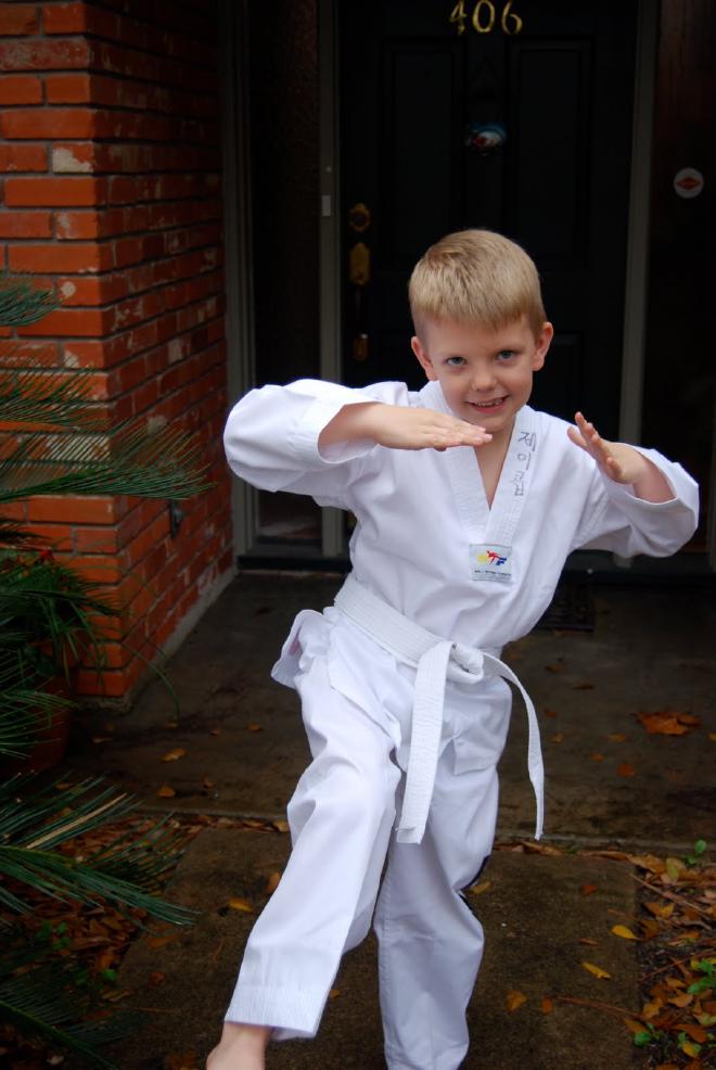 Jacob has been asking for quite some time to do karate. There was a taekwondo place offering a one month trial class so we signed up. I have no idea what the difference between taekwondo and karate is but they have the same uniform (I’ve been told to stop calling it an “outfit”!) so I figure tae kwon do will work for us just fine.
