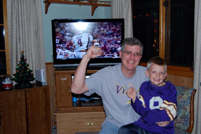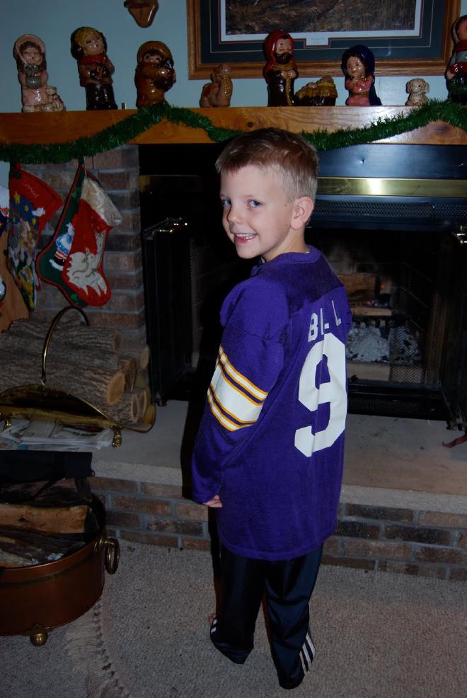 Bill is a tried and true Minnesota Vikings fan. He grew up watching them year after year. He wore this jersey when he watched them play and handed it over to Jacob while we were visiting Minnesota over Christmas. Jacob was VERY excited.
