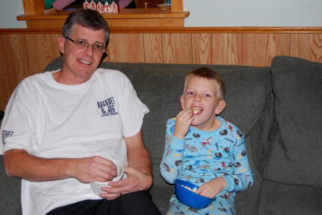 I remember when Jacob was a newborn and we would put the girls to bed and Jacob would lay in Bill’s arms and “watch” the game. Bill would have a bowl of popcorn in one hand and Jacob in the other. When we watched the game in MN, it was clear … not much has changed: