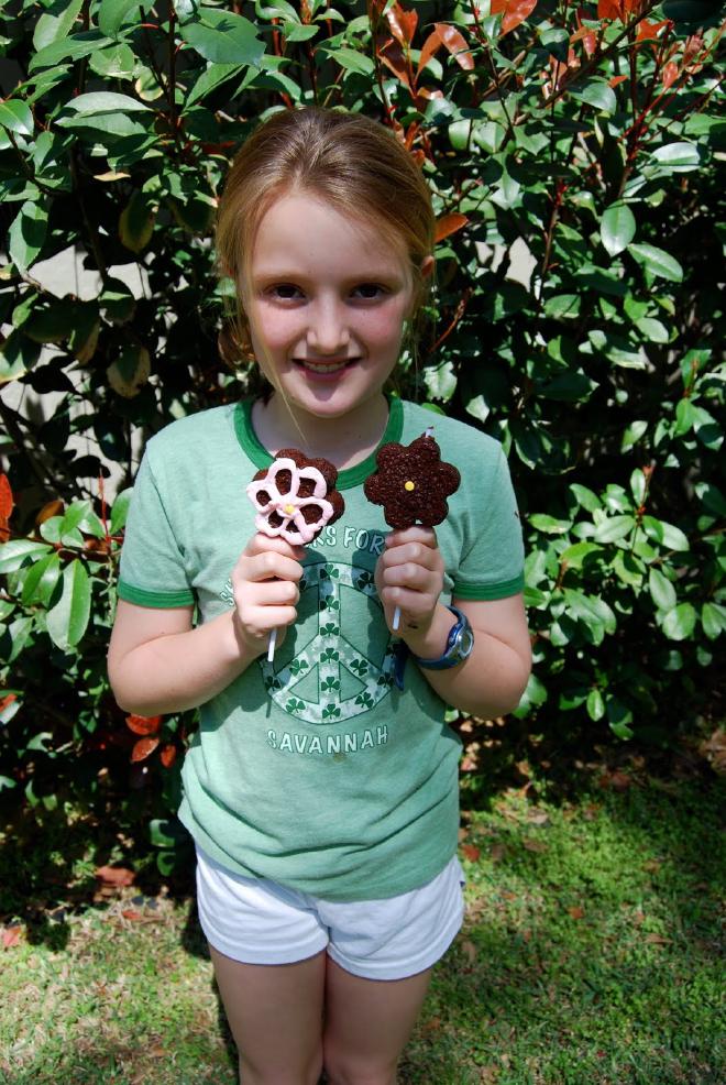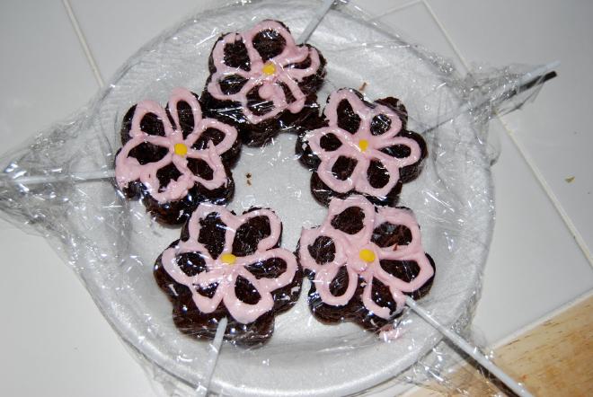 Any who … here are my cute flower brownies on a stick held by a cute girl wearing green: