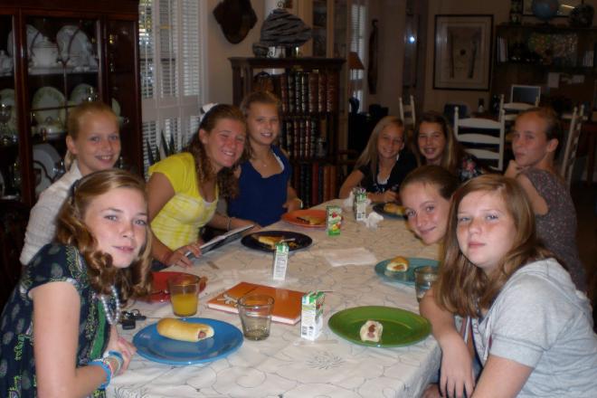 Brittany went to middle school. One of her friends invited her and several others over for breakfast before they went to school. They all enjoyed seeing each other and then got to ride in the car and all walk in together.