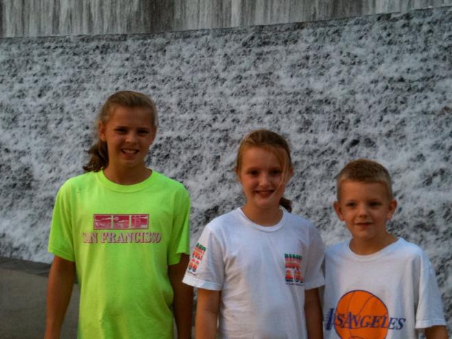 As we left I remembered that on every list of “things you shouldn’t miss when you have visitors come to Houston” is the Transco water tower which is right next to the Galleria. The kids had never seen it so we drove by to take a peek. As I was driving home I decided that was lame and we turned around and went back and got OUT of the car. I mean, this is the closest thing Houston has to Niagara Falls and it is really neat to see and stand up close to it. So we did.