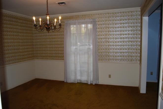 The dining room, close up (by the way … see that chandelier … we almost burned down the house with that, accidentally, of course. When we were having piers added to the foundation after Christmas, the workers put plastic over the light). We came over that night with some friends and turned the light on. Later we began to smell smoke and the plastic had melted down, was smoking and those lights are blackish now. Oops.).