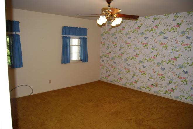 Master bath is configured very differently. There is a wall down the middle of it. I have never seen a carpeted bathroom before … and it even has a ceiling fan in it. I can’t wait for you to see the “after”!