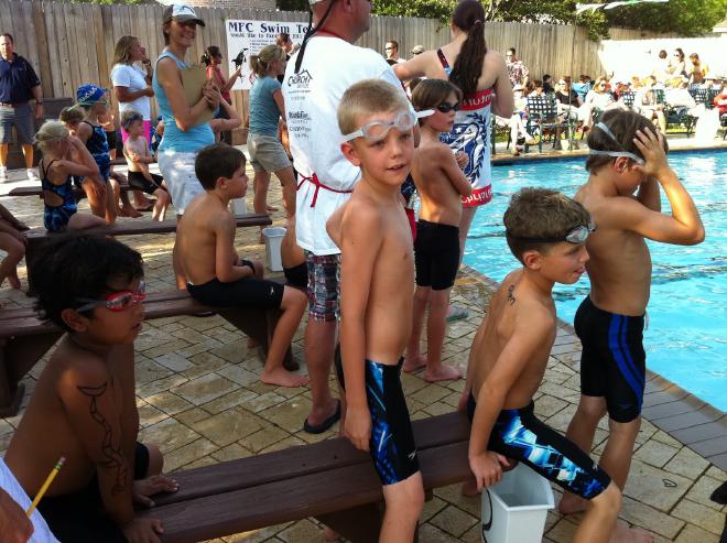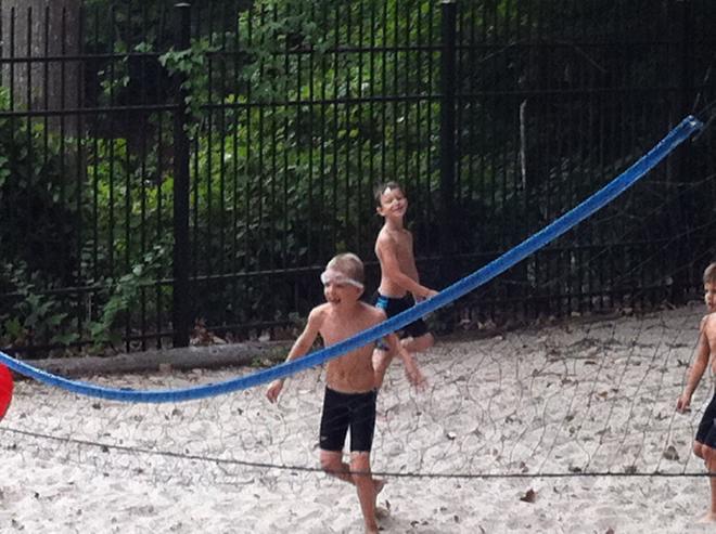 Each morning after practice Jacob hangs out on the sand volleyball court while his sisters swim: