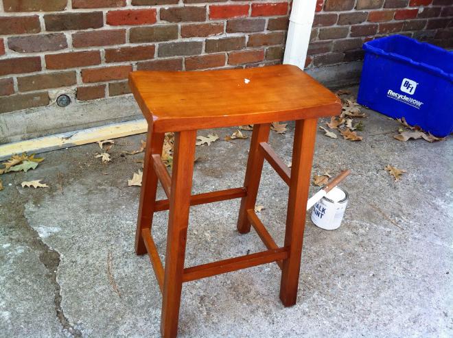 I decided to start small with an inexpensive stool I bought at Walmart. It fits perfectly under our island but wasn’t the right color.