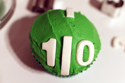 You can find fondant it in most craft stores. Roll it out thin and cut out your numbers. You’ll also need to cut some thin, straight strips to go in between each number on top of the cupcake.