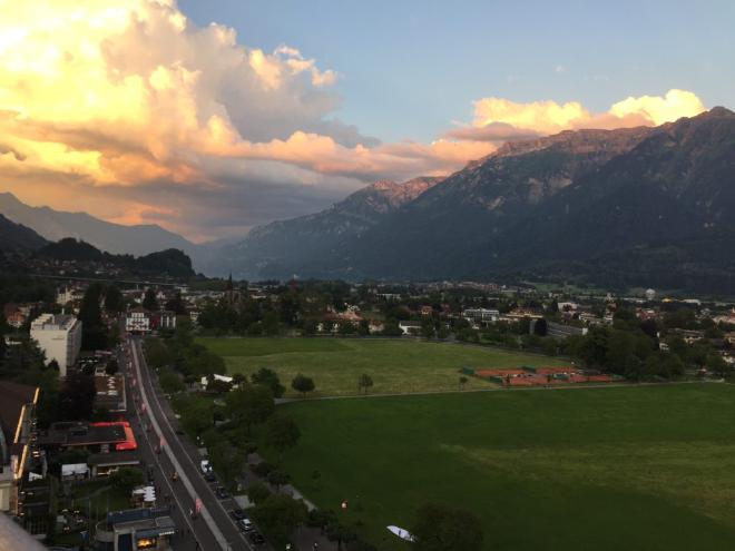 Bill is MR. TRAVEL GUIDE and heard of a restaurant we should try in Interloken. It was on the top floor of a hotel and gave us some incredible views of the lake in the distance. While we ate our dinner we enjoyed watching the paragliders drift down to a field just below the restaurant.